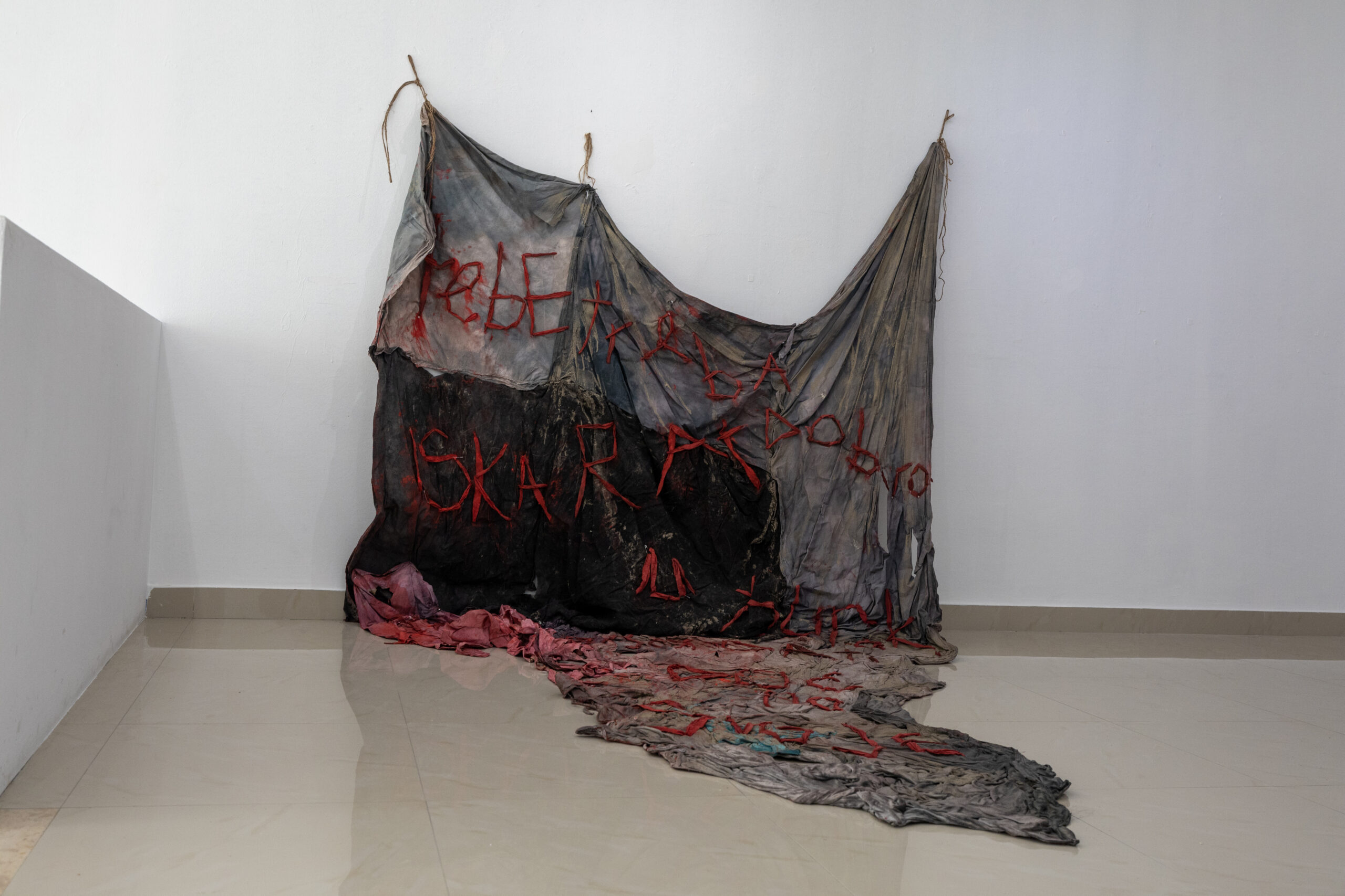 U sklopu istraživanja za diplomski rad, autorica je provela anonimnu anketu među ženama različitih starosnih dobi kako bi prikupila njihova iskustva u pojedinim socijalnim situacijama. Kroz analizu odgovora, autorica se usredotočila na šest najčešćih odgovora koje je implementirala u realizaciji instalacije u prostoru koja se sastoji od šest komada izvezenih iskaza na posebno izrađenoj podlozi od bojane stare posteljine. Kombinirajući različite tkanine u smjesi ljepila, gipsa, vode, pijeska i žarko ružičastog akrila, autorica stvara vizualni efekt koji naglašava iscrpljenost, težinu i raspadanje. Nadalje, odabrane odgovore iz ankete Bebić je reducirala na ključne riječi, oblikujući ih u ručno bojane trake i prišivajući ih na istu podlogu, sada izvezenu ženskim pismom. Autorica terminom „prišivanje ili vezenje reduciranih riječi“ opisuje tjelesne kretnje, stvarajući ne samo estetski eksperiment, već i kritički osvrt na društvene dinamike i prirodu ženskog identiteta. Kroz fizičku izvedbu i upotrebu ženskog pisma, simbolično i nasilno probadanje naglašava fizički napor i nasrtanje na tkaninu, koja predstavlja onog slabijeg i bez mogućosti samoobrane. Istovremeno, samoozljeđivanje prilikom probadanja krutog materijala, koji ostavlja ogrebotine, dodatno podsjeća na nasilje i traumu, čineći ga sastavnim dijelom umjetničkog procesa. U subverzivnom kontekstu tradicionalnih ženskih poslova, tzv. žensko pismo postaje ključno sredstvo za iščitavanje osobne i kolektivne boli, kao i dekonstrukciju patrijarhalnih struktura, pitanja roda, identiteta i društvenih struktura.