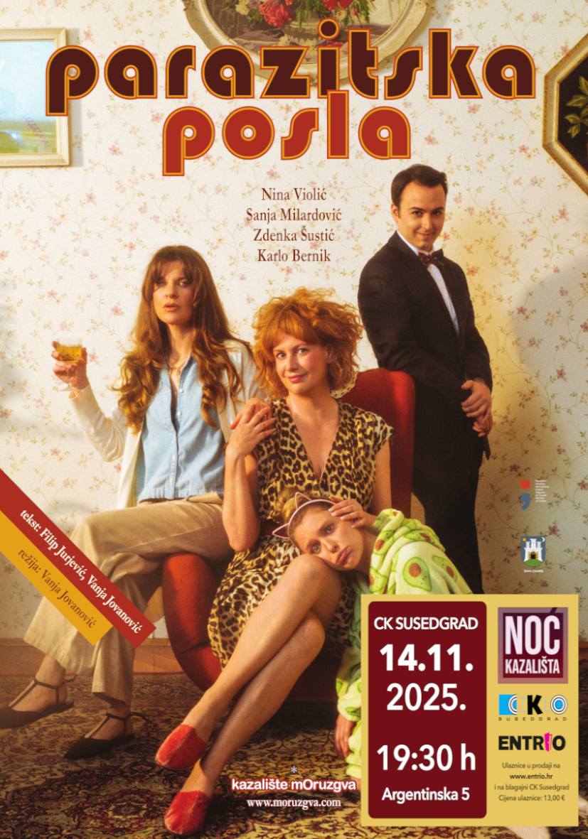 Kazalište Moruzgva donosi novu britku komediju “Parazitska posla” koja progovara o tome što se stvarno događa kad se obitelj opet nađe pod istim krovom. Ovaj kazališni komad pun je duhovitih dijaloga, prepoznatljivih situacija i likova koji će vam istovremeno biti i smiješni i poznati.