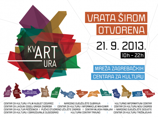 Zagrebački centri za kulturu okupljeni u projekt kvARTura ove godine organiziraju zajedničko predstavljanje svog rada, koje će se u svakom od 13 centara održati 21.rujna od 10 do 22 sata. Tog će dana u sklopu manifestacije nazvane Vrata širom otvorena svaki Centar predstaviti programe koje nudi.