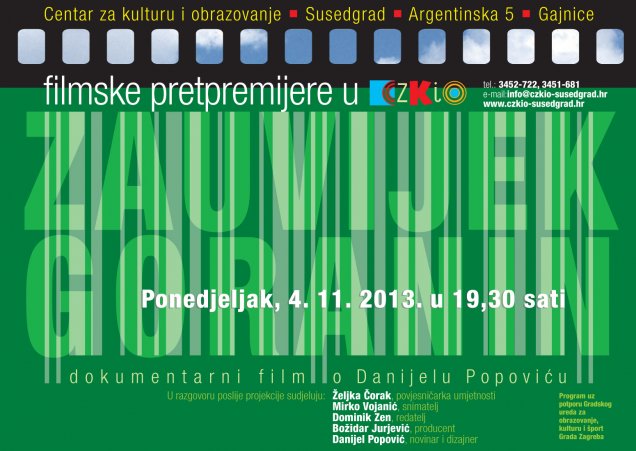 U ciklusu "Filmske pretpremijere u CZKIO Susedgrad" u ponedjeljak, 4. studenoga. 2013. u 19,30 sati u velikoj dvorani Centra za kulturu i obrazovanje Susedgrad, Argentinska 5 ( Gajnice ),održat će se projekcija filma "Zauvijek Goranin – Danijel Popović ", a ulaz je slobodan.