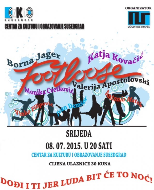 Vrlo uspješan i nagrađeni projekt OŠ Gornje Vrapče, mjuzikl "Footloose", šira će publika imati prilike pogledati u srijedu, 08.07.2105. u dvorani CZKIO Susedgrad (Argentinska 5, Gajnice). Mjuzikl izvode učenici viših razreda osnovne i 2.razreda srednje škole. Predstava počinje u 20 sati, a ulaznice (cijena 30 kn) će se moći kupiti 08.07.2015. od 19 sati u Centru. Zainteresirani za ulaznice, sve obavijesti mogu dobiti na telefon 098 448850.