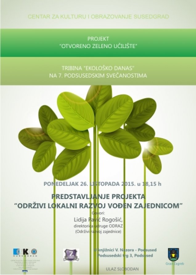 Najstarija kontinuirana ekološka tribina u gradu Zagrebu, Tribina "Ekološko danas" gostuje početkom idućeg tjedna u programu 7.Podsusedskih svečanosti. U ponedjeljak, 2610.2015., u 18,15 sati u Knjižnici V.Nazor - Podsused (Podsusedski trg 3), gđa. Lidija Pavić Rogošič, direktorica udruge ODRAZ (Održivi razvoj zajednice) prezentirat će podsusedskim aktivistima i stanovnicima Podsuseda projekt "Održivi lokalni razvoj vođen zajednicom".
