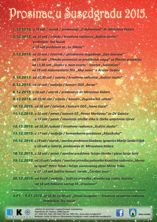Najavljujemo programe koji će se odvijati u Czkio Susedgrad tijekom prosinca, uz najavu besplatne zimske kreativne radionice za mlade.
