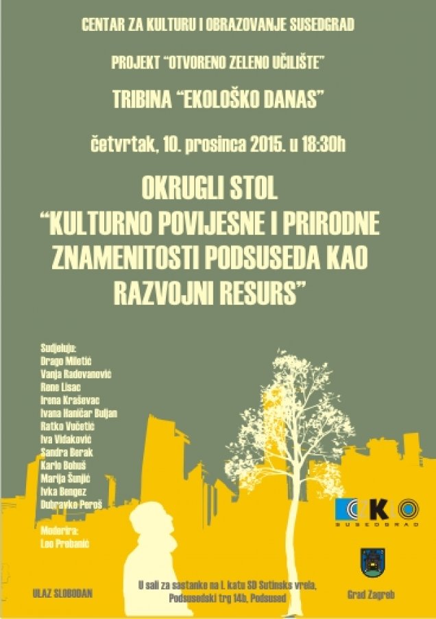 Projekt "Otvoreno zeleno učilište" i Tribina "Ekološko danas" nastavljaju s povezivanjem ekoloških i kulturnih tema na našem području, a ove godine nam je, zahvaljujući upornom radu njegovih aktivista, u fokusu Podsused. U suradnji s Udrugom EKO 2000 iz Podsuseda organiziramo u četvrtak, 10.12.2015. okrugli stol "Kulturno-povijesne i prirodne znamenitosti Podsuseda kao razvojni resurs", u sali za sastanke na I.katu SD "Sutinska vrela"(Podsusedski trg 14b, u Podsusedu). Okrugli stol počinje u 18,30 sati, a svi zainteresirani su dobrodošli.