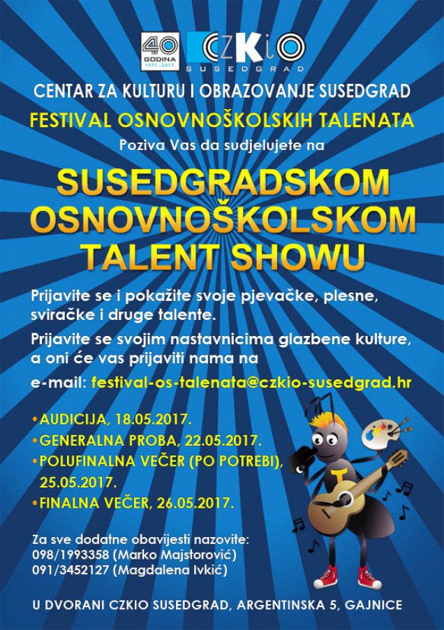 Festival osnovnoškolskih talenata Centra za kulturu i obrazovanje Susedgrad poziva škole na sudjelovanje na SUSEDGRADSKOM OSNOVNOŠKOLSKOM TALENT SHOWU. Prijavite se i pokažite svoje pjevačke, plesne, sviračke i druge talente. Učenici, prijavite se svojim nastavnicima glazbene kulture, a oni će vas prijaviti nama na e-mail: festival-os-talenata@czkio-susedgrad.hr