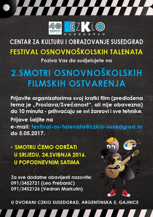 Festival osnovnoškolskih talenata Centra za kulturu i obrazovanje Susedgrad poziva škole i školske filmske družine na sudjelovanje na 2. SMOTRI OSNOVNOŠKOLSKIH FILMSKIH OSTVARENJA. Prijavite svoj kratki film (predložena tema je „Proslava/Svečanost, ali nije obavezna) do 10 minuta – prihvaćaju se svi žanrovi i sve tehnike. Prijave šaljite na e-mail: festival-os-talenata@czkio-susedgrad.hr do 5.5.2017.
