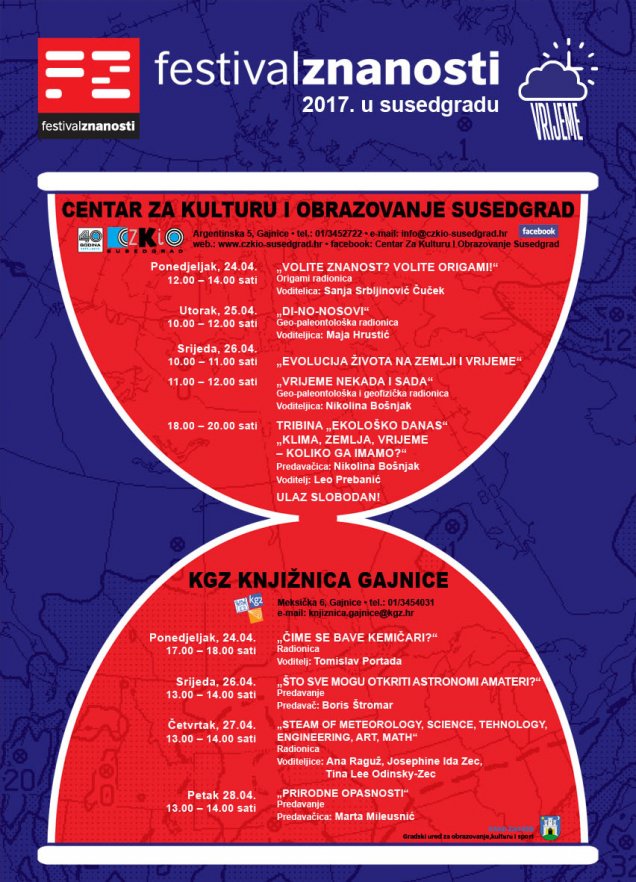Ni 15.Festival znanosti neće proći bez svog susedgradskog dijela koji organiziraju Centar za kulturu i obrazovanje Susedgrad i KGZ Knjižnica Gajnice. U tjednu od 24. do 28.04.2017. oni su pripremili čitav niz zanimljivih radionica i predavanja i jednu eko-tribinu.
