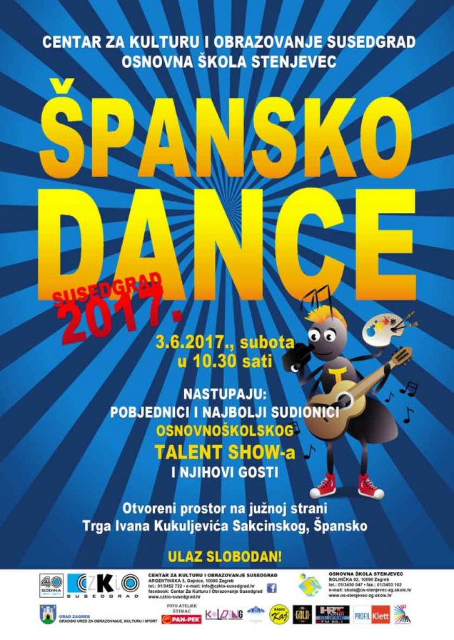 "Špansko dance" je završna manifestacija "Festivala osnovnoškolskih talenata 2017." , na kojoj će nastupiti pobjednici i finalisti ovogodišnjeg "Talent show-a" i njihovi gosti. Pozivamo sve zainteresirane da nam se pridruže u subotu, 3.06.2017. kod otvorene pozornice na južnoj strani Trga Ivana Kukuljevića u Španskom, u 10,30 sati.