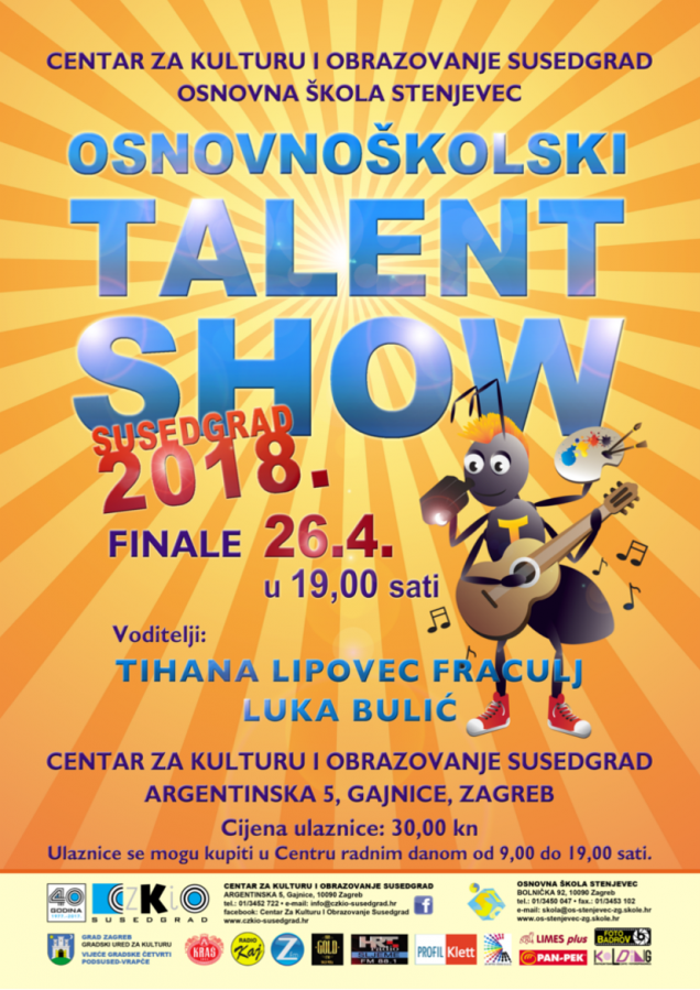 Jubilarni 5.Susedgradski osnovnoškolski Talent Show je pred vratima! Završavaju posljednje pripreme za veliku audiciju, u utorak, 17.4.2018., s početkom u 17 sati, na kojoj će se više od 20 natjecateljskih točaka iz 17 zagrebačkih osnovnih škola boriti za mjesta u velikom Finalu, u četvrtak, 26.4.2018. u 19 sati. I audicija i finalna večer održat će se u velikoj dvorani Centra za kulturu i obrazovanje Susedgrad (Argentinska 5 u Gajnicama), a karte za finalnu večer, po cijeni od 30,00 kuna, mogu se nabaviti u Centru, radnim danom od 9 - 19 sati.