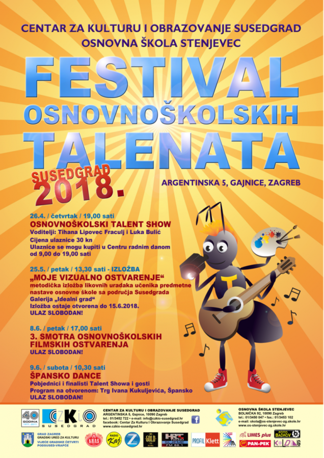 I ove godine "Festival osnovnoškolskih talenata", Susedgrad 2018.!!! Radi se o projektu koji se sastoji od četiri manifestacije: 26.4. 2018. /četvrtak/ u 19,00 sati - Osnovnoškolski Talent show;25.5.2018. /petak/ u 13,30 sati – „Moje vizualno ostvarenje“, metodička izložba likovnih uradaka učenika predmetne nastave osnovne škole sa područja Susedgrada i 8.6.2018. /petak/ u 17,00 sati – „3. smotra osnovnoškolskih filmskih ostvarenja koje će se održati u CZKIO Susedgrad (Argentinska 5, Gajnice), a završni "Špansko dance" 9.6.2018. /subota/u 10,30 sati na otvorenoj pozornici na Trgu Ivana Kukuljevića u Španskom. Dobro nam došli!