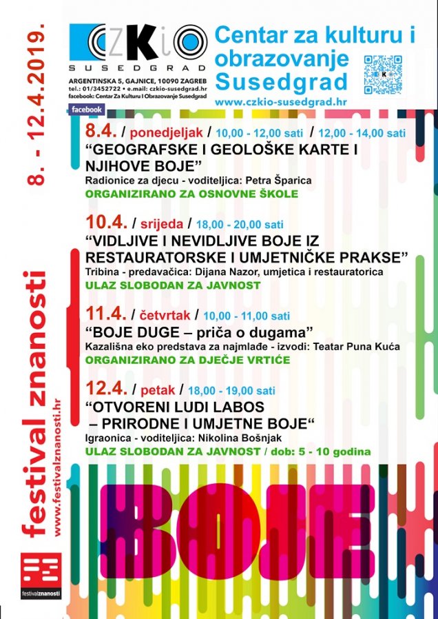 Festival znanosti 2019. godine je s temom „boje”. Festival znanosti je događanje čija je svrha približiti znanost javnosti, odnosno informirati javnost o aktivnostima i rezultatima iz područja znanosti, poboljšati javnu percepciju znanstvenika te motivirati mlade ljude za istraživanje i stjecanje novih znanja. Centar za kulturu i obrazovanje Susedgrad i ove godine sudjeluje u Festivalu znanosti sa svojim programima. U ponedjeljak, 8.4. održat će se radionica pod nazivom „Geografske i geološke karte i njihove boje” pod vodstvom Petre Šparice, a organizirana je za osnovne škole. U srijedu, 10.4. s početkom u 18,00 sati održat će se tribina „Vidljive i nevidljive boje iz umjetničke prakse”, predavanje će održati prof.dr. Dijana Nazor. Tribina će se održati u prostorijama galerije Idealni grad i otvorena je za javnost. U četvrtak, 11.4. Teatar Puna Kuća izvest će predstavu „Boje duge – priča o bojama” , a organizirana je za dječje vrtiće. U petak, 12.4. s početkom u 18,00 sati održava se „Otvoreni ludi labos” pod vodstvom dr.sc Nikoline Bošnjak. Radionica je primjerena za uzrast od 5 do 10 godina i otvorena je za javnost. Prijave za sudjelovanje u radu Ludog labosa šaljite na adresu elektronske pošte: renato@czkio-susedgrad.hr info@czkio-susedgrad.hr ili na brojeve telefona: 091 3452 129, 01 3452 722 VESELIMO SE VAŠEM DOLASKU!